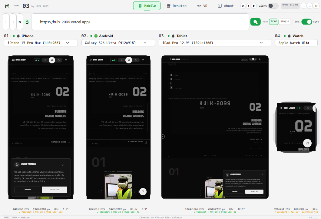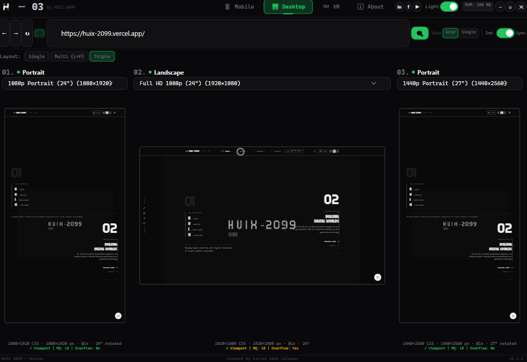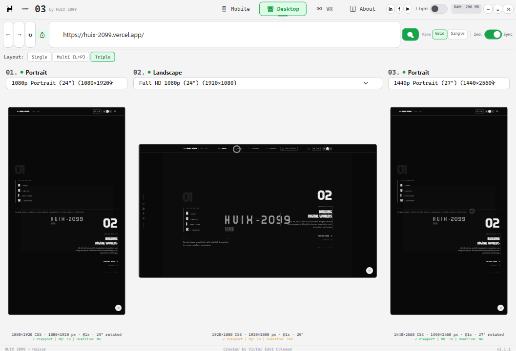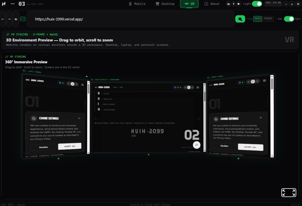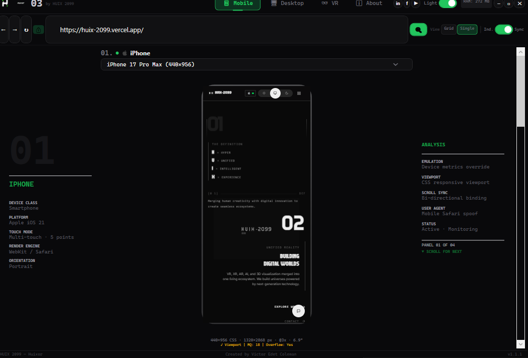 +------------------------------------------------------------------+ | ROW 0: TITLE BAR | | Logo | Version | Nav | Social | Theme | RAM | Controls | +------------------------------------------------------------------+ | ROW 1: URL BAR | | Back Forward Refresh | Lock | URL | Search | View | Scroll | +------------------------------------------------------------------+ | ROW 2: CONTENT AREA | | Mobile / Desktop / VR / About | +------------------------------------------------------------------+ | ROW 3: STATUS BAR | | HUIX 2099 — Huixor | Victor Edet Coleman | v1.1.1 | +------------------------------------------------------------------+