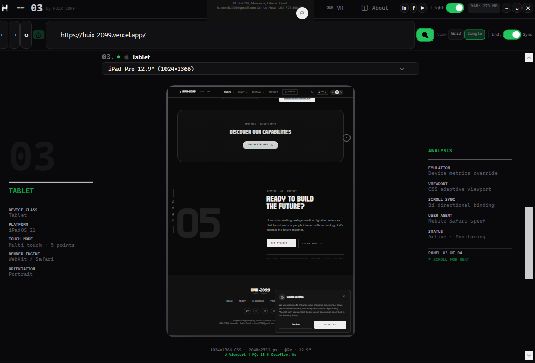 Huixor previews any website across device categories — iPhone, Android, tablet, watch, desktop monitors, and a VR environment — simultaneously in a single window. It is built with WPF + .NET 8 and WebView2, using the Chrome DevTools Protocol for faithful emulation.